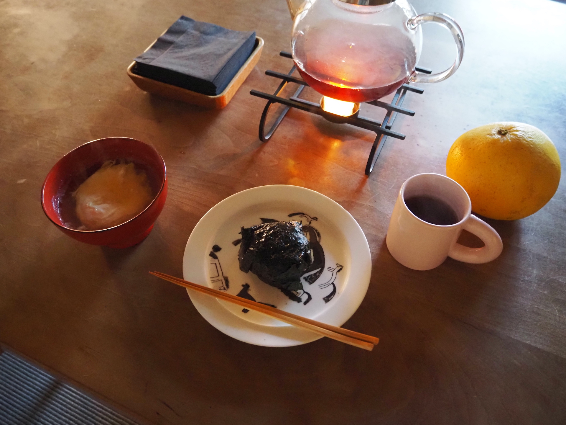 朝ごはんはおにぎりと卵を落としたお味噌汁。