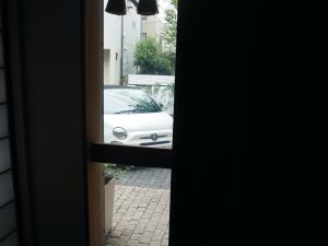 大きさが半分になった印象の車を、玄関から